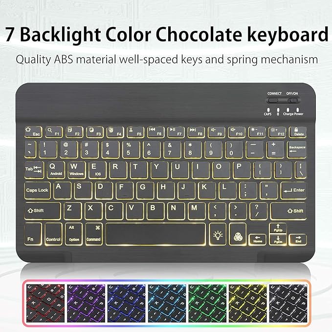 - ✔【Detachable Wireless Keyboard with Rainbow Backlit】7 colors rainbow back-light make typing fun and easy in the dark/night, you can change the colors on keyboard's left, middle and right seperatly. The Bluetooth connection is stable and mechanical scissor keys are quiet with rebound feature. With the U.S Chipset, helping you to type stable and fast. Rechargeable battery make keyboard can work wireless for longer time, provide the freedom to read or work anywhere at any time
