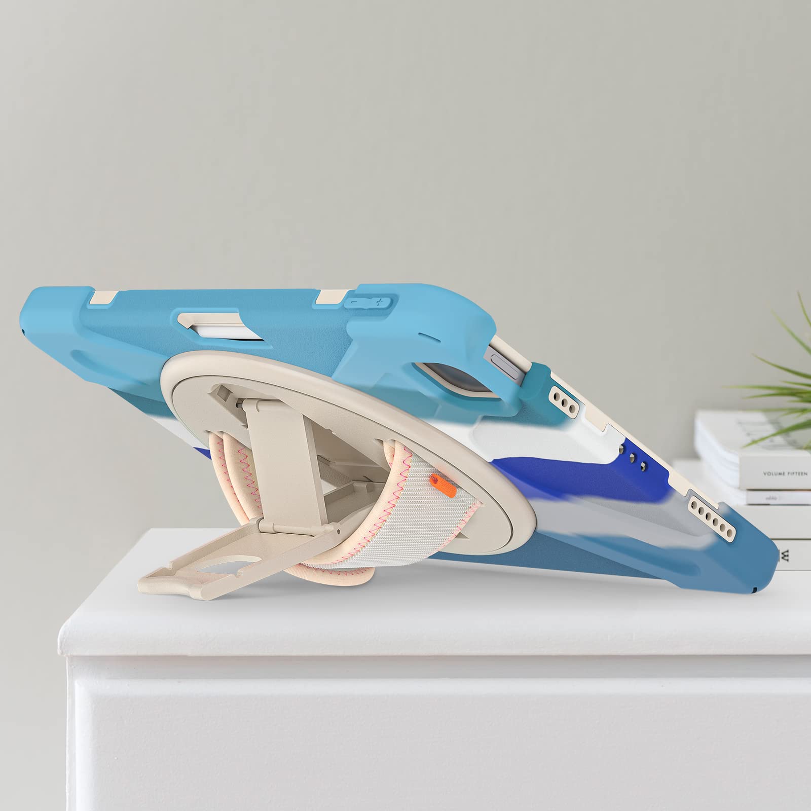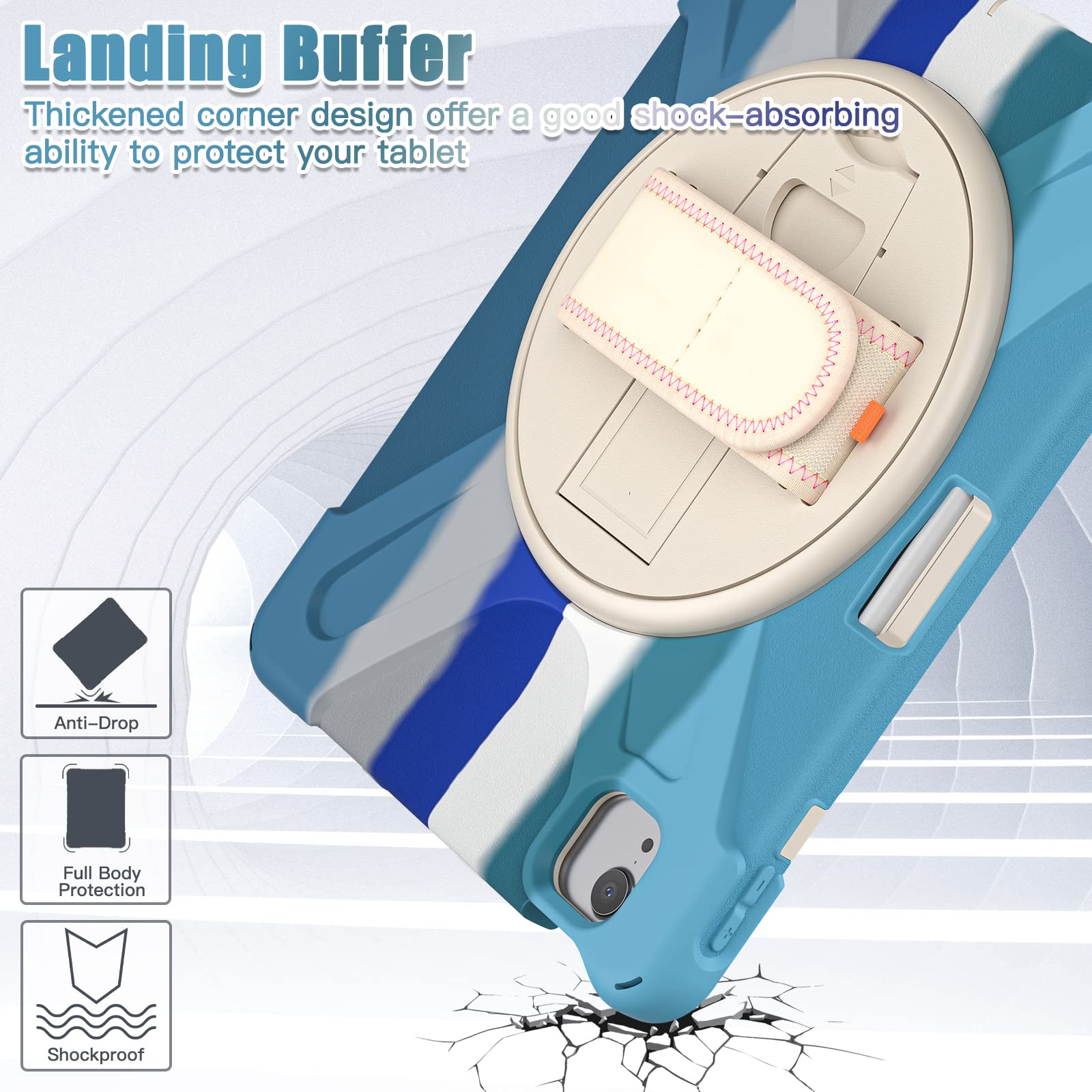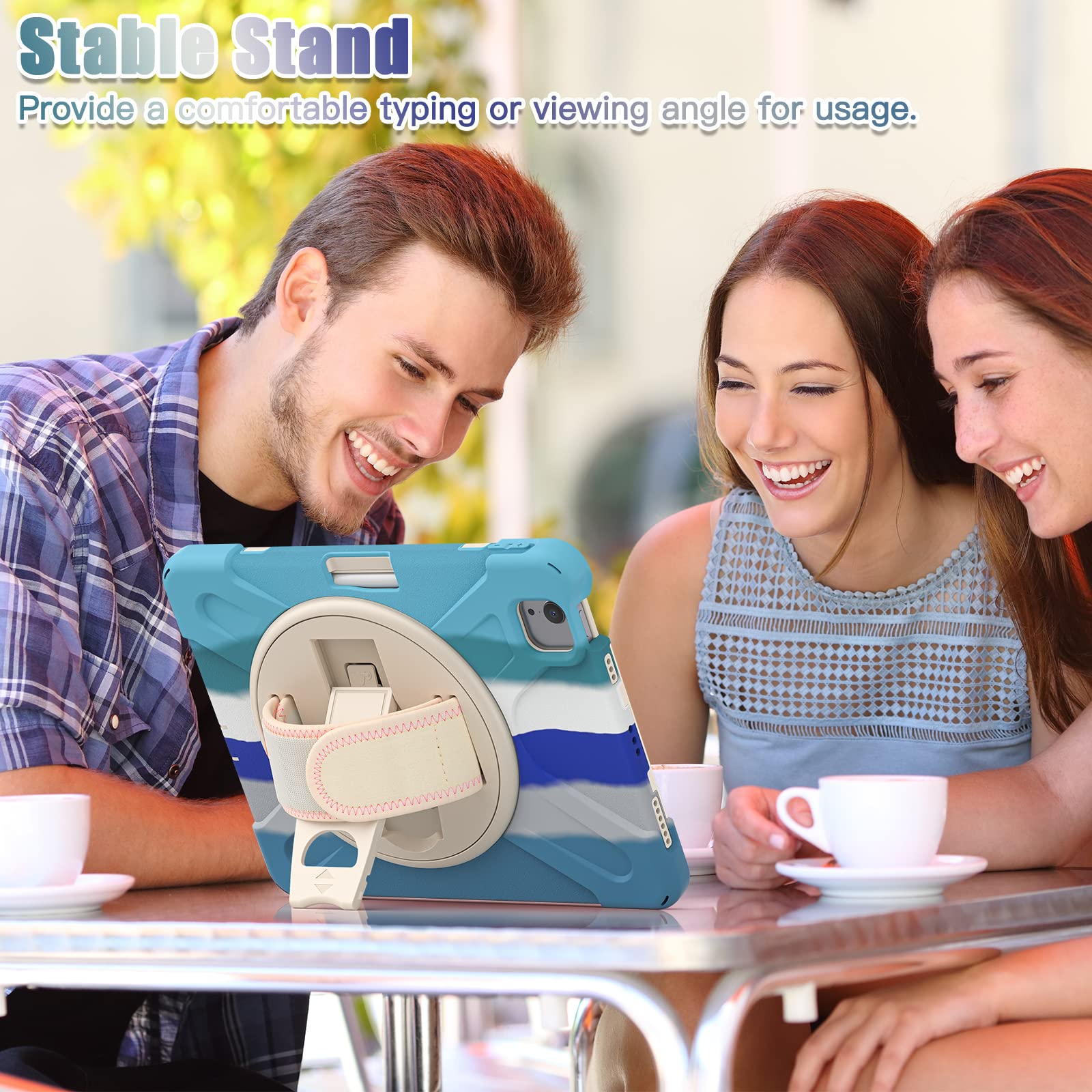 • [360 Degree Rotating Stand]: On the back side of the high impact resistant plastic rubber dropproof kidsproof bumper 10.9 inch Apple iPad tablet case there is a sturdy 360 degrees swivel foldable kickstand.Convenient for watching videos,conferences, construction and outdoor work.