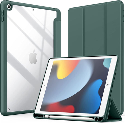 ProElite Smart Flip Case Cover for Apple iPad 10.2 inch 2021 9th/8th/7th Gen, Clear Soft Back with Pencil Holder, Dark Green