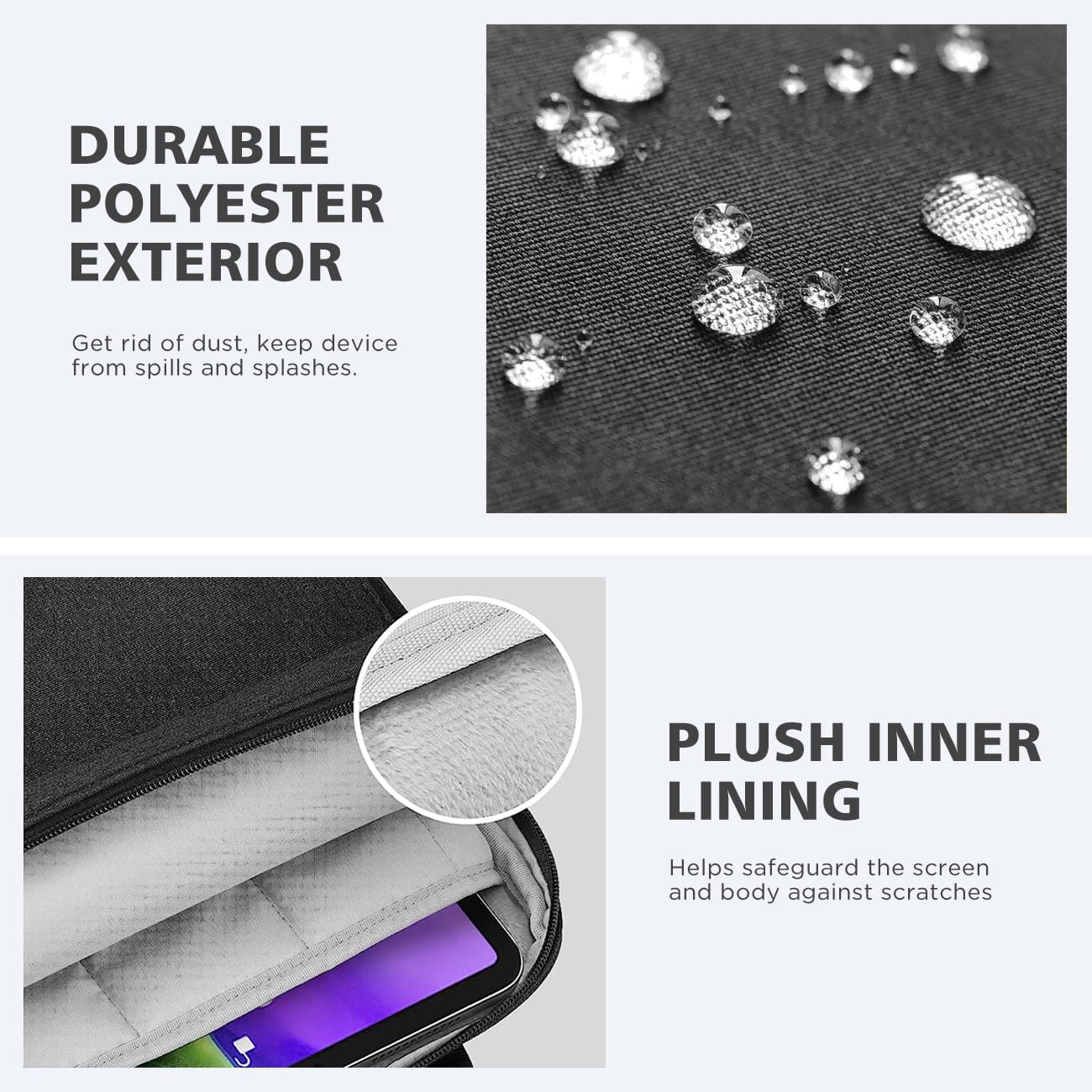- PREMIUM MATERIAL: Polyester exterior features wear-resistant against dust and splash. Thick sponge padding protects your tablet and items from shocks, collision and being squeezed. Soft inner lining prevents scratches. High-end material gives your device a superior protection.