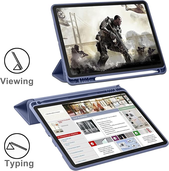 • Two Viewing Angles: Trifold stand design with dual standing provide two positions for comfortable viewing or typing, you can have an excellent experience when you are relaxing or working.